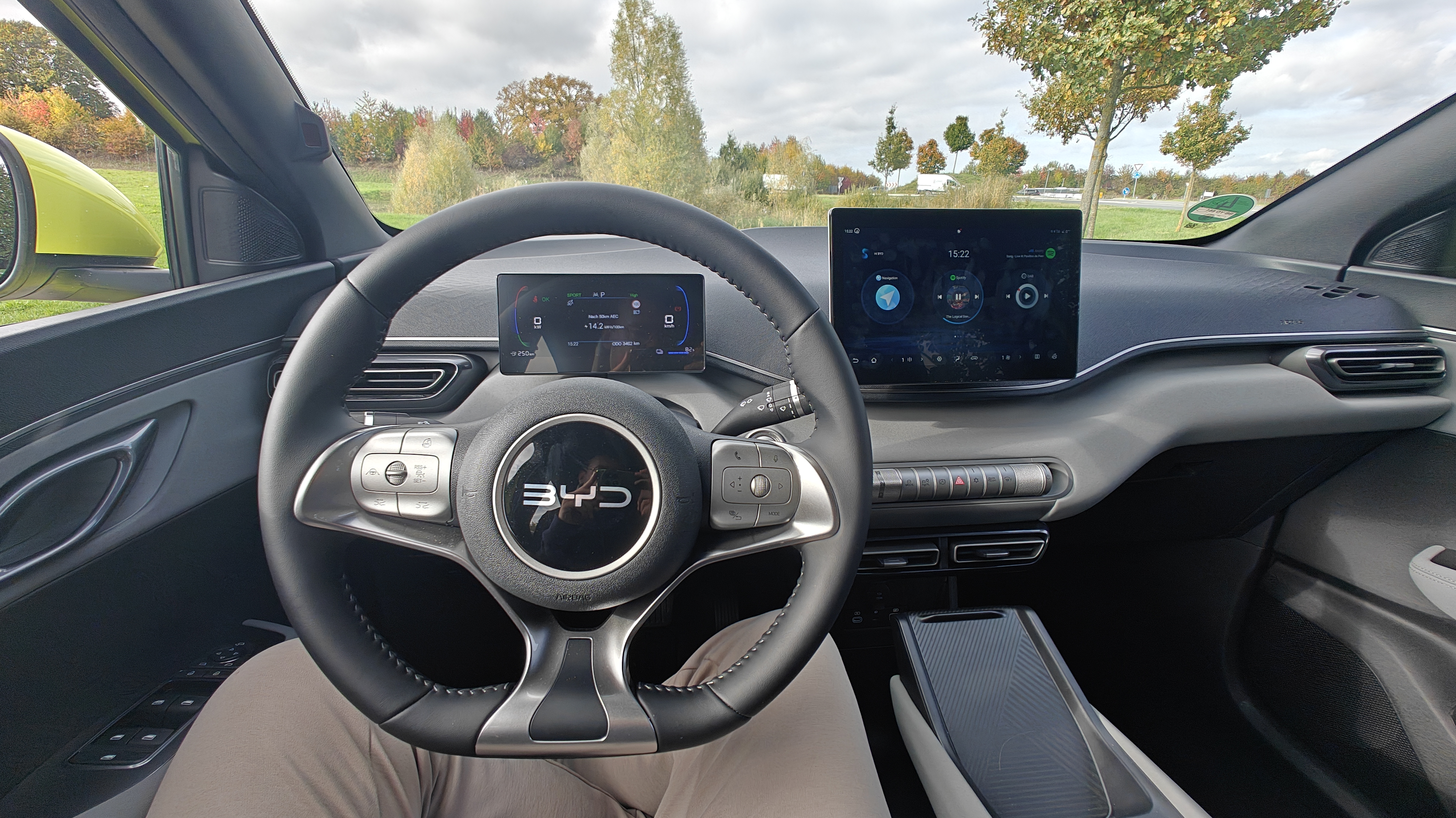 Der Innenraum des Dolphin Surf wirkt zunächst unauffällig, auf das wesentlichste reduziert. Das zentrale, 10,1 Zoll große Touchdisplay hat allerdings eine Überraschung parat: Per Knopfdruck legt es eine Drehung um 90 Grad hin, und erlaubt somit einen Wechsel zwischen Vertikal- und Horizontalausrichtung. Insbesondere beim Streamen von YouTube-Videos, was neben weiteren Streamingdiensten über das Infotainmentsystem möglich ist, bietet sich ein Wechsel zur horizontalen Ausrichtung gut an.